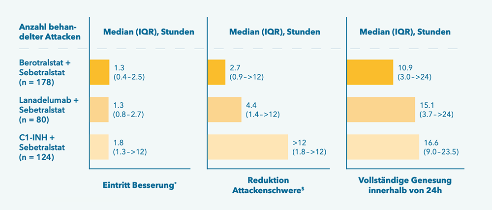 Pflichttext Orladeyo 150 mg Hartkapseln. Wirkstoff: Berotralstat. Zusammensetzung: 1 Hartkapsel enthält 150 mg Berotralstat (als Dihydrochlorid). Sonstige Bestandteile: Kapselfüllung: Crospovidon (Typ A), Magnesiumstearat, hochdisperses Siliciumdioxid, vorverkleisterte Stärke; Kapselhülle: Gelatine, Titandioxid (E 171), Indigocarmin (E 132), Eisen(II,III)-oxid (E 172), Eisen(III)-oxid (E 172); Druckfarbe: Eisen(II,III)-oxid (E 172), Kaliumhy-droxid, Schellack, Propylenglycol (E 1520). Anwendungsgebiete: Routinemäßige Prävention wiederkehrender Attacken des hereditären Angioödems (HAE) bei Erwachsenen und Jugendlichen ab 12 Jahren. Gegenanzeigen: Überempfindlichkeit gegen Berotralstat oder sonstige Bestandteile. Nebenwirkungen: Kopfschmerzen (inklusive Sinuskopfschmerzen); Abdominalschmerz (inklusive abdominaler Beschwerden, Oberbauch- oder Unterbauchschmerzen, epigastrischer Beschwerden, abdominalem Druckschmerz); Diarrhö (inklusive weichem Stuhl, häufiger Darmentleerungen); Erbrechen; gastroösophagealer Reflux; Flatulenz; Ausschlag; ALT oder AST erhöht. Dieses Arzneimittel unterliegt einer zusätzlichen Überwachung. Dies ermöglicht eine schnelle Identifizierung neuer Erkenntnisse über die Sicherheit. Weitere Angaben: siehe Fach- und Gebrauchsinformation. Verschreibungspflichtig. BioCryst Ireland Limited, Block 4, Harcourt Centre, Harcourt Road, DUBLIN 2, D02HW77, Irland. |